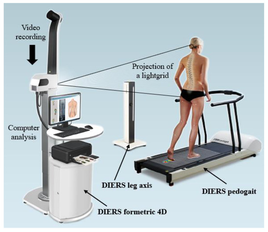 The DIERS formetric 4D equipment is the basic module of the whole DIERS system. The system also consists of additional modules DIERS Leg Axis that realizes a fast and highly effective geometric analysis of the lower limbs and DIERS Pedogait that measures the distribution of the pressure on the foot during walking [,,,,].