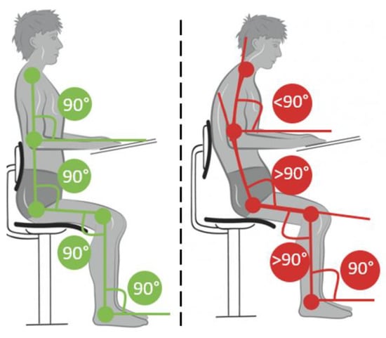 Two types of posture were scanned for each chair—erect and relaxed sitting (see Figure 3). The erect sitting is characterized by the 90° angle that should be formed by the thighs with the trunk, the arms and forearms, the thighs and shanks and the lower leg with the foot. If the angles between these body parts do not form a 90° angle, it is a so-called relaxed sitting position [,,,,].