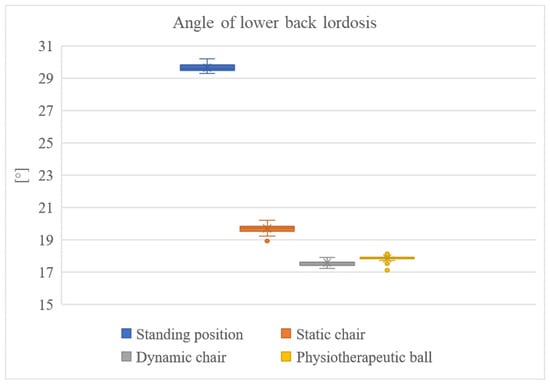The diagram in Figure 9 depicts the range of the measured values of the lower back lordosis angle. Compared with the lower back lordosis angle in the standing position, this angle is significantly lower in the sitting position. However, it is permissible due to the biomechanics of the sitting position. The value range of the individual types of the sitting positions are mutually comparable, but the lowest values of the lower back lordosis were measured for sitting on a dynamic chair.