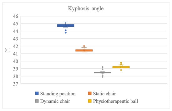The diagram in Figure 10 depicts the range of the measured values of the lowest values of the kyphosis angle. Similarly, as in the case of the lower back lordosis, the kyphosis angle is also significantly lower in the sitting position than in the standing position. The lowest values of the kyphosis angle were measured again for sitting on a dynamic chair.