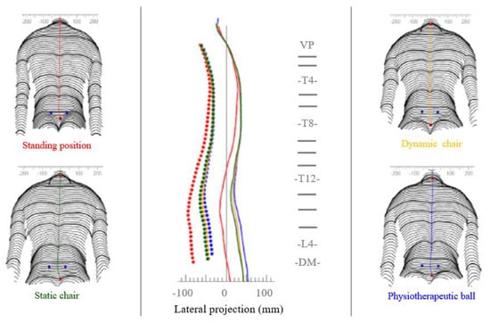 Currently, there are investigations in the area of measuring the curvature of the spine in the sitting position. These investigations used the generally known medical methods for diagnostics—X-ray or MRI [,,,]. For our research, we used the equipment DIERS based on the principle of the Raster Stereography. One of the reasons why we utilized this tool is that the repeated scanning process does not create undesirable effects for human health [,,].