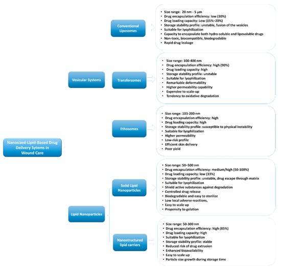 Among the most promising possibilities of overcoming these issues, nanosized-lipid-based drug delivery systems can provide unique properties for delivering drug molecules in the targeted areas and improve skin wound healing. They are classified as vesicular systems and lipid nanoparticles [,] (see Figure 1). Furthermore, we emphasize their structures in Figure 2.
