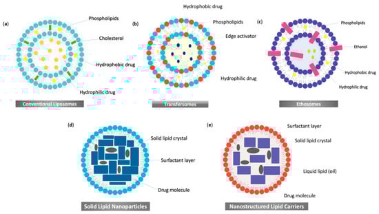 Ethosomes are updated versions of conventional liposomes and are composed of phospholipids, cholesterol and a large amount of alcohol (20–45%) [,] (see Figure 2c). Their lipid membranes are less tightly packed than other vesicle membranes, allowing them to be more flexible. Commonly used phospholipids for the preparation of ethosomes are phosphatidylcholine, phosphatidic acid, phosphatidylserine and phosphatidylethanolamine. Some preferred alcohols are ethanol and isopropyl alcohol []. The presence of ethanol determines a negative surface charge that prevents the aggregation of vesicles due to electrostatic repulsion. Ethanol is an efficient penetration enhancer and, due to its properties, ethosomal formulations have shown higher permeation, more prolonged action and long-term stability in storage []. Furthermore, increasing the ethanol concentration increases the EE% of the ethosomes [], which is typically reported as high [].