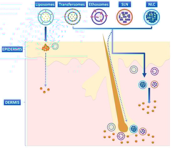 Schematic illustration of the anatomical target sites and skin penetration pathways of the nanosized-lipid-based drug delivery systems. Liposomes penetrate as an intracellular delivery system and deposit the drugs into the stratum corneum. They have poor penetration of the drug into the dermis. Transfersomes squeeze through the intercellular parts of the corneous layer or penetrate through the transfollicular pathway to release the drug into the dermis. Ethosomes penetrate stratum corneum lipids through fluidization, using transfollicular or intercellular pathways and releasing the drug into the dermis. Nanostructured lipid carriers (NLCs) and solid lipid nanoparticles (SLNs) penetrate through intercellular and transfollicular pathways into the dermis.