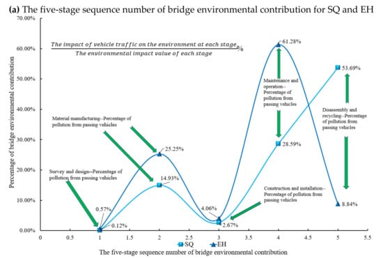 The contributions of the two cable-stayed bridges to environmental emissions in five phases are analyzed first, as shown in Figure 5. Data sources include design contracts and plans, data from the survey and design phase, construction drawings, geological survey reports, construction organization design, published research results, observed local transportation data, observation data obtained from environmental protection and meteorological departments, and the Ecoinvent and Bedec databases. The criteria for the use of research resources include rich experience in bridge engineering, scientific research theories, and comprehensive research and analysis capabilities.