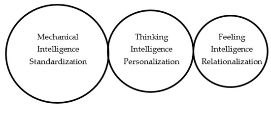 Several articles in the literature carried out an analysis of automation, autonomy, and intelligence, which allows us to understand the most relevant terms. For instance, Insaurralde and Lane [23] define automation as the ability of a system to automatically carry out a certain process by following a code. They define autonomy as the ability of a system to carry out an automatic process by making decisions, implementing the choices made, and checking the evolution of such actions, i.e., make choices on its own. On the other hand, the human intelligence literature usually defines intelligence as the human ability to learn over time and adapt to the external environment [24,25]. Moreover, the artificial intelligence literature refers that intelligence is the capacity of mimicking human intelligence [26], such as the ability of knowledge and reasoning [27], problem-solving [28], communicating, interacting, and learning [29]. Huang and Rust [26] and Huang et al. [30] also proposed three artificial intelligences—mechanical, thinking, and feeling (Figure 1).