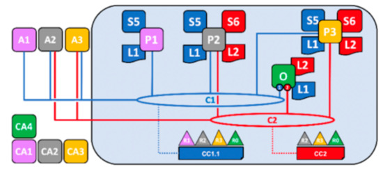 Figure 1 shows an example of the Hyperledger Fabric network from the official documentation [28]. The notation of nodes in the figures are as follows: Application (A), Certificate Authority (CA), Channel (C), Peer (P), Ordering Service (O), Ledger (L), Chaincode (S), Organization (R), and Channel Configuration (CC). The organization is defined by the Membership Services Provider (MSP), where every organization configures the channel configuration and makes each node join in a secure private channel. The certificate authority generates the certificates to the nodes, and the certificates must be signed in every transaction. When any client executes an application, the application sends a transaction proposal to all endorsing peers via the configured channel. These peers reply to a signed proposal response to the application. The transaction will package into a block by ordering the service node; the node also orders and distributes it to every peer, then the transaction is done and updates to the blockchain network.