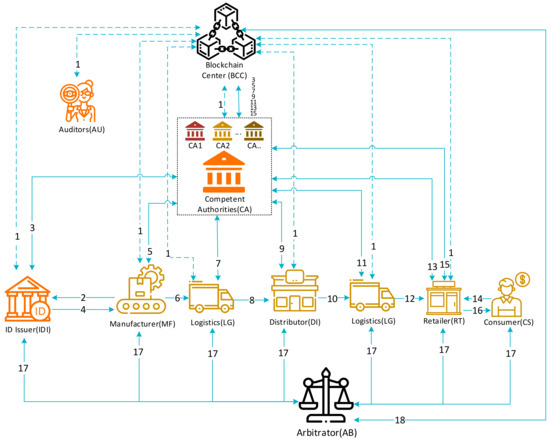 In this research, we proposed a blockchain-based traceable and authenticated tobacco products logistics system with GPS and RFID technologies. The proposed system is constituted of the following twelve parties: ID issuer, tobacco ID tag, mobile reader, competent authorities, manufacturer, distributor, logistics, retailer, consumer, arbitrator, auditors, and blockchain center. The system framework is shown in Figure 2.