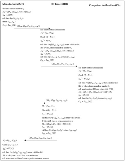 - After receiving the IDs, MF produces tobacco products. Every pack of tobacco products needs to send the GPS location, ID, the timestamp of production, and the MF’s ID by the MR to the CA, then the information is sent and chained in the BCC.