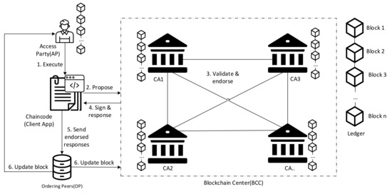We implemented a blockchain-based system in the proposed scheme shown in Figure 15. Each CA had a ledger, and the blocks in the ledger were synchronized with the PBFT consensus algorithm. When an accessing party executes a chaincode function, the modification of the chaincode will be chained to the ledger. The latest ledger will be validated from every CA department that participates in the blockchain center. It is hard to modify and forge the data in the ledger.