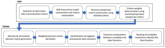 The proposed work presented in this paper provides a hybrid AHP/TOPSIS approach for pointing out an optimal site to open a commercial store. The reasons for selecting the AHP and TOPSIS methods are multi-fold. First and foremost is that the AHP and TOPSIS are among the most widely adopted MCDM techniques due to their simplicity and accuracy [26]. Secondly, when combined, they can reduce the computational efforts required to rank the alternatives. Other MCDM methods such as ANP, BWM, ELECTRE, or PROMETHEE would have been considered if one of our goals was not lowering the computational complexity and time required to find the ranking. Furthermore, TOPSIS works well with AHP quite nicely; that is, AHP is good for computing the criteria weights, while TOPSIS is good for ranking based on given weights. With other MCDM methods, such a hybrid approach is either not possible or not effective while non-hybrid approaches are computationally not feasible.