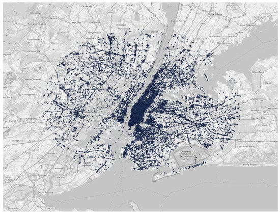 The area-popularity criterion can be easily found with a location-aware social networking application. Here, FourSquare is exploited to gather user check-in details at various business attractions to find out their popularity. The FourSquare dataset for this research work consists of check-in information within New York City from 12 April 2012 to 16 February 2013 (approx. 10 months). A total of 227,428 check-ins in New York City are contained in this data set and are shown in Figure 4. There is a time stamp, GPS coordinates, and some semantic meaning (expressed with the fine-grained venue-categories) connected to every check-in [42]. The area popularity factor is computed with the help of this check-in dataset.