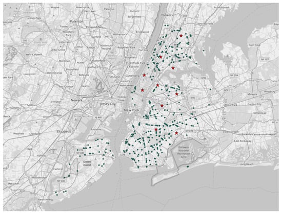 In this step, the competitors, traffic, popularity, and vehicle owner criteria are considered to select an optimal gas station site. Once the set of candidate gas station sites is provided, the very first step is to compute the criteria. Second, the candidate sites are evaluated with the AHP/TOPSIS technique to identify the ideal site for a new gas station. In Figure 6, red stars represent the candidate gas station sites (provided by user) and green circles explicitly provide the location of existing gas station sites in New York City.