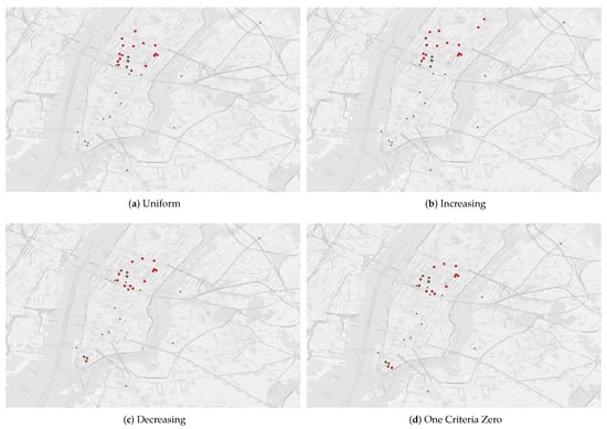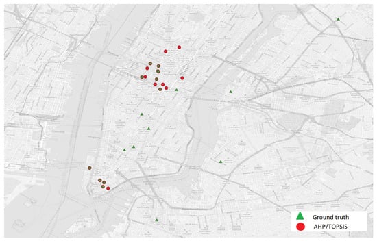 For the random weight vectors uniform, increasing, decreasing, and oneCriteriaZero above, we obtained the TPRs 0.25, 0.25, 0.4, and 0.35, respectively. The TPRs are far lower than the one obtained using carefully derived weights, i.e., 0.55. Figure 9 shows the placement of ground truth convenience stores (green triangles) and the AHP/TOPSIS-predicted convenience stores using the manual weights (red circles). As can be observed from the obtained TPR values of the different weight vectors, the AHP/TOPSIS approach is heavily dependent on the criteria weight computation.