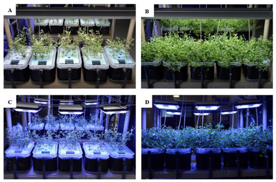 The effect of LED lighting on plant hydroponic production has been more intensively studied using more traditional crops [29,46]. The use of blue and red LEDs (alone or combined) seems to improve the quality and yields of several vegetables and fruit when compared with fluorescent lighting [31]. In aquaponics, for instance, the productivity of kale (B. oleracea) and Swiss chard (Beta vulgaris L.) is higher with LEDs [47] and some studies suggest that blue LEDs seem to stimulate leaf area enlargement and the aboveground development of lettuce (Lactuca sativa L.) and other vegetables (e.g., Chinese cabbage, spinach and coriander) [28,48].