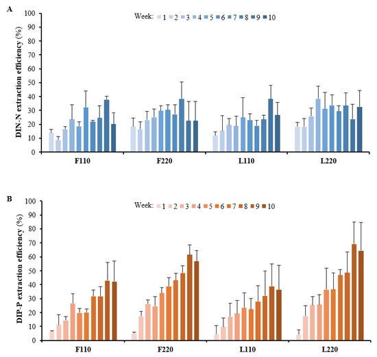 Extraction efficiency of (A) DIN–N and (B) DIP–P (n = 5). Error bars represent standard deviations.