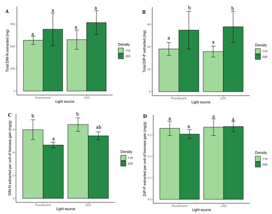 Total quantity of extracted (A) DIN–N and (B) DIP-P and relative quantity (per biomass gain) of extracted (C) DIN–N and (D) DIP–P (n = 5). Bars represent standard deviations. Different letters (a,b) indicate significant differences between treatments (p < 0.05).