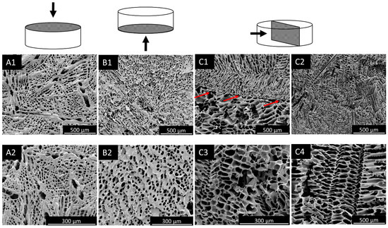 Figure 4). When the walls of the mould were insulated using PTFE (low thermal conductivity), the polymer solution froze from the bottom to the top, resulting in an anisotropic heat transfer and, therefore, anisotropic scaffold microstructure, as in