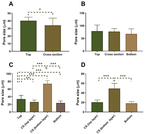 Figure 3 illustrates the microstructure of the PGSU-bilayer scaffolds. In this case, the top layer was made from PGSU-15% and bottom layer from PGSU-10%, thus there is a difference in pore structure when it is observed from the cross-section. The bilayer scaffold shows both isotropic and anisotropic structures. It is clear where the layers meet and a good attachment between them is also evident. The pore structure on the surface is similar to when the scaffold was being imaged from its top and bottom section. The pore sizes of the PGSU-bilayer were measured, and multiple pore sizes were found depending on the layer and the section. Considering each layer individually, there was a significant difference between the pore size of the top layer (PGSU-15%) when compared with that of its cross-section. A similar observation was found from the bottom layer (PGSU-10%). There was also a significant difference between the pore size of the different layers, especially in the cross-section. The pore size for the PGSU-15% layer was 26.2 ± 4.9 μm and the pore size for the PGSU-10% layer was 74.0 ± 8.4 μm, which is an approximately 2-fold difference.