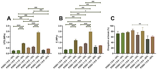 Figure 6. It can be noted that, in almost all cases, there was a significant difference between the ultimate tensile strength (UTS) and Young’s modulus (E) of the samples but not the elongation at break. This signifies that the glycerol:HDI molar ratio and the pre-polymer concentration do not affect the elongation at break, except for the scaffolds with 20% pre-polymer concentration, which were found to be lower than the rest and, in one case, a statistically significant difference was found.. The scaffolds exhibited a UTS ranging from 0.25 ± 0.04 MPa to 1.91 ± 0.10 MPa and an E ranging from 0.33 ± 0.05 MPa to 1.97 ± 0.26 MPa. The biggest difference was found when comparing the scaffolds with glycerol:HDI molar ratio of 1:0.8 against the case with the ratio of 1:1.0. The UTS and E both increased by approximately 3-fold, while the elongation at break remained very similar. This is an advantage of the PGSU scaffolds developed here, because they have the potential to be used for multiple tissues with varying mechanical properties (e.g., tendon, skin, ligaments and mucosa) [