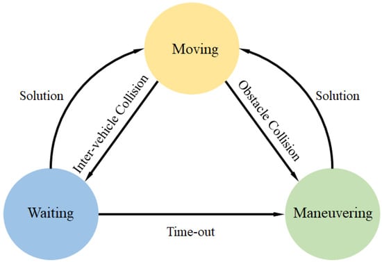 However, a deadlock may occur especially when most agents are congested in such an environment as in a blind alley. To solve such a problem, we set a constant  to prevent an agent from waiting for overtime. If  exceeds the waiting time bound, a  state will be invoked, as shown in Equation (1).