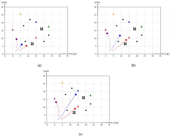 Figure 4a shows that the 6 agents are encountered with a dead-end corner shortly after they moved for some distance at the beginning. Nevertheless, the leading agents would invoke a  state when they found that no path was available. On the other hand, the following agents behind would switch the  state to the  state and thus waited for their teammates to move. To prevent the deadlock for the whole team to wait for each other, we preset a time-out variable . The  is randomly assigned from 2 to 3 s for dealing with the synchronizing problem. That is, every agent will start to move and search for new feasible paths after the time-out. Finally, if there is a feasible path, the team would successfully find the alternative route and then continue to move toward the target.