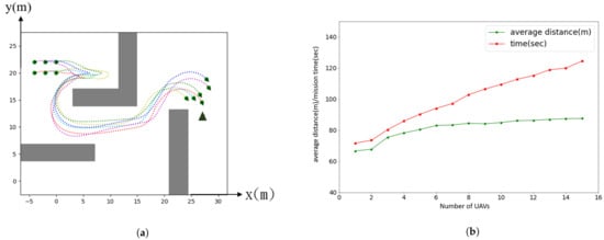 Figure 4b shows the analysis of agent’s performance from  to 15, where  represents a single agent which does not require formation coordination. The green line denotes the agent’s average distance, while the red line denotes the total spent time. Since we define  m/s in the simulation, the average waiting time when agents are being stuck can be analyzed from the difference between both lines. It can be seen that the average distance is not affected much by increasing the number of agents that implies the stability and efficiency of the formation coordination algorithm. On the other hand, the total time spent depends on N due to the waiting of agents to get around the obstacle that blocks the team moving direction. In the situations where agents attempt to find a way out of the obstacles, each agent will switch between the  and the  states to prevent a deadlock. In another word, its behavior is somewhat similar to data retrieval in a stack (i.e., last-in-first-out structure) and the total time spent is a linear growth depends on N.