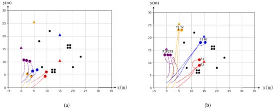 Figure 6 shows the simulation of multiple static targets. The purpose of this simulation is to evaluate the effectiveness of our algorithm in the case of multiple targets and obstacles. In the experiments, we adopted nine agents that were randomly placed around the starting position and took off at the same time to approach four goal targets which are indicated by triangular symbols with a different color in a 2D space. Obstacles were placed randomly between the starting positions of agents and the targets with varying sizes, as shown in Figure 6a,b shows the result of the simulation using the proposed method. Agents were grouped into four subgroups and planned the trajectories autonomously. The trajectory and formation are based on minimum costs which include the distance, the compactness of the group without the inter-collision among agents and the collision with obstacles.