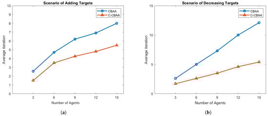 Efficiency comparison between CBAA and C-CBAA algorithms under different target change scenarios.