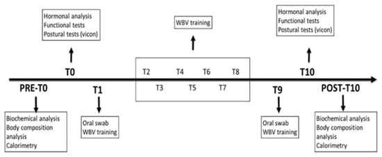 This is a pilot, randomized, double-blind and controlled clinical study following the guidelines of the Consolidated Standards of Reporting Trials (CONSORT) conducted on patients with obesity (BMI ≥ 35 kg/m2). An extensive medical screening was performed by a physician who checked inclusion and exclusion criteria. Neither the patients nor the trainer who conducted the training program were blinded. Subjects were randomly assigned to one of the four experimental groups after the initial evaluation. After randomization, 11 subjects were assigned to the WBV Group 1, 10 were assigned to the WBV Group 2,10 were assigned to the first control group (Group 3), 10 were assigned to the second control group (Group 4). We used a customized platform with the capacity to accommodate obese patients (Power club, Ferrara, Italy). One patient in Group 1 dropped out. The baseline data were collected at Pre-T0, T0, and T1. At Pre-T0, we collected biochemical samples, body composition data, and calorimetry of the patients. At T0, the day before the beginning of WBV training, blood samples for hormonal analysis were collected and the postural and functional tests carried out. The first training session of the protocol (T1) was performed the day after T0. At T1, biological samples of saliva immediately before and after the training session were collected. The samples of saliva collected were assayed by ELISA kit only in those subjects who completed 9 WBV series. All the tests were repeated after 3 weeks of training, at T9, T10, and Post-T10, as reported in the timeline in Figure 1.