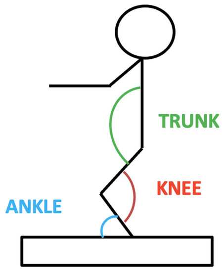 The posture was monitored with an optoelectronic system with 6 infrared cameras (Vicon, Vicon Motion System, Oxford, UK) and reflecting markers positioned on the hip, knee, ankle, and the shoulders as shown in Figure 3.