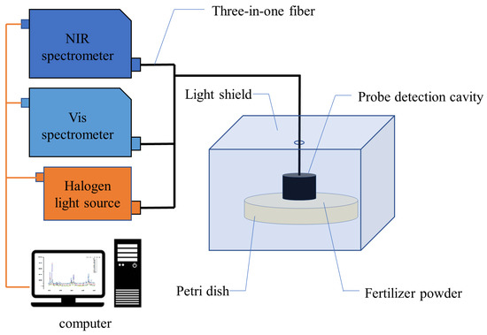The equipment for collecting spectral signals is shown in Figure 2. It included a portable NIR spectrometer, a portable Vis spectrometer, and a halogen lamp. The NIR spectrometer (SW2520, Wuling Optics Co., Ltd., Shanghai, China) has a measurement wavelength range of 950~1700 nm, and the highest optical resolution is 8.0 nm. The Vis spectrometer (EE2063, Wuling Optics Co., Ltd., Shanghai, China) has a measurement wavelength range of 180~1100 nm, and the highest optical resolution is 0.2 nm. The two spectrometers and the halogen lamp were connected to each other through a three-in-one optical fiber. The halogen light source was emitted from the end of the optical fiber to the probe detection cavity. After the light was reflected on the sample surface, it entered the NIR/Vis spectrometers through the optical fiber. The two spectrometers collected spectral signals synchronously, and both were set to automatically save the average value of 5 consecutive spectral signals. Both spectrometers were set to save the spectrum signal with 0.5 nm accuracy in order to unify the data processing. For the case where the highest optical resolution of the spectrometer was lower than 0.5 nm, the software automatically performed interpolation operations.