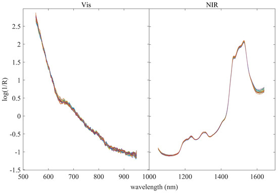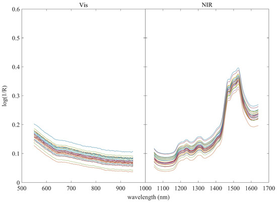 This research collected the spectral signals of fertilizer samples in powder form. The specific process was as follows. The fertilizer powder was spread in a Petri dish with a diameter of 75 mm and the surface was smoothed with a glass plate, the probe detection cavity was connected at the end of the three-in-one optical fiber, and the probe detection cavity was placed on the flat surface of the fertilizer powder for measurement. The light source and spectrometers were turned on, and after the temperature of the light source and spectrometers stabilized, the spectral signals were collected. The whole experiment process was carried out under shaded conditions. Combining the band coverage of the light source and the performance of the spectral signals in different bands, the spectral band with large noise was removed, and finally the spectral signals of 550~950 nm in the Vis spectrometer, and 1050~1640 nm in the NIR spectrometer were intercepted, as the original spectrum for subsequent analysis. The spectral curves of one sample group is shown in Figure 3.