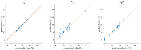 It can be seen from Figure 5 that the correlation between the experimental and predicted values of the N content and K2O content in the prediction set was relatively good, and the prediction deviation of the nutrient content was basically within 5%, while the P2O5 content was not so ideal, with a maximum of 5~10% content prediction deviation.