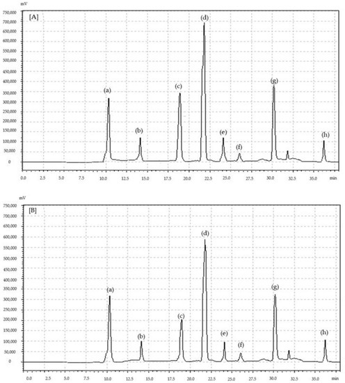 Chromatograms showing retention times for polyphenols (phenolic acids and flavonoids) in organic (A) and conventional (B) blackcurrant; (a) chlorogenic, (b) caffeic, (c) quercetin-3-O-rutinoside, (d) ferulic acid, (e) kaempferol-3-O-glucoside, (f) myricetin, (g) quercetin-3-O-glucoside, (h) kaempferol.