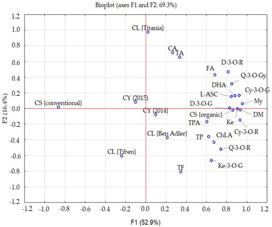 PCA analysis showing the relationship between the chemical composition—total polyphenols (TP), total phenolic acids (TPA), chlorogenic acid (ChLA), caffeic acid (CA), quercetin-3-O-glycoside (Q-3-O-Gy), ferulic acid (FA), total flavonoids (TF), kaempferol-3-O-glycoside (Ke-3-O-G), quercetin-3-O-rutinoside (Q-3-O-R), myricetin (My), kaempferol (Ke), total anthocyanins (TA), quercetin-3-O-glucoside (Q-3-O-G), cyanidin-3-O-rutinoside (Cy-3-O-R), delphinidin-3-O-rutinoside (D-3-O-R), cyanidin-3-O-glycoside (Cy-3-O-G) and delphinidin-3-O-glucoside (D-3-O-G), in to experimental cultivation year (CY), cultivar (CL) and agronomic system (AS).