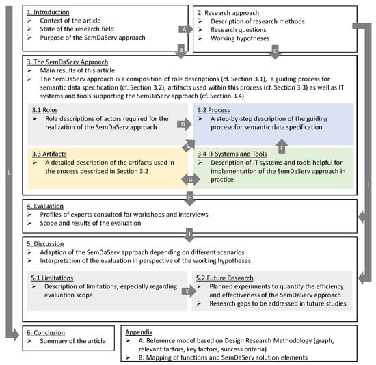 The structure of the article is presented in Figure 1: (A) Based on the state of the research field and resulting research gaps described in Section 1, research questions, working hypotheses, and research methods are described in Section 2. (B) Additionally, the purpose of the SemDaServ approach described in Section 1 and (C) the research questions described in Section 2 are setting the scope for Section 3. Section 3 is the main section of this article containing a detailed description of the SemDaServ approach in four sub-sections: (D) Section 3.1 describes the business roles required to conduct the guided process for semantic data specification described in Section 3.2. (E) The artifacts used in this process are described in Section 3.3. (F) The IT systems and tools described in Section 3.4 are helpful to support the realization of the process described in Section 3.2. (G) Additionally, IT Systems and tools described in Section 3.4 can be used for the creation and storage of the artifacts described in Section 3.3. The coloring of the boxes in Figure 1 that represent Section 3.2, Section 3.3 and Section 3.4 is used throughout the article: Blue represents processes, yellow represents artifacts, and green represents IT systems and tools. (H) Section 4 presents the evaluation of the SemDaServ approach. (I) The study design of the evaluation (Section 4) is described in Section 2. (I, J) The working hypotheses described in Section 2 are discussed in Section 5 while taking the results of the evaluation (Section 4) into account. (K) Section 5.1 describes the limitations of the presented SemDaServ approach, especially regarding the evaluation scope. These limitations will be addressed in future research, described in Section 5.2. (L) Section 6 summarizes the article. Appendix A presents details linked to the descriptive study I (cf. Section 2). As the focus of this article is on the SemDaServ approach, the descriptive study I—which mainly focuses on the state of the art and research gaps—is necessary to understand the research approach but is not part of the SemDaServ approach.