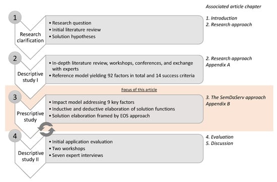 Prescriptive study (3): The reference model was used to formulate the desired situation of positively impacting the success criteria. For this purpose, we first identified nine key factors (the most promising factors for improving on the existing situation ([] p. 21), cf. Table A4). Then, we used an inductive approach to define solution functions in the context of the key factors. To do so, we abstracted sub-functions to more general main functions. After that, we applied a deductive approach to close gaps in the resulting functions architecture, detailing the main functions. The resulting functions architecture, as well as a mapping connecting it to the solution elements of the SemDaServ approach, are presented in Table A5. After designing the functions architecture, we systematically designed SemDaServ by addressing these functions according to the Engineering Operating System (EOS) [] shown in Figure 3.