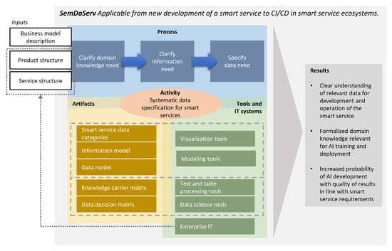 Reviewing the state of the art, new service engineering methods are required to systematically develop AI components of smart services. Ref. [] While there are many methods, tools, and processes for SSS development (cf. [] giving an overview), there is a lack of approaches that systematically make use of expert domain knowledge—which is highly relevant in industrial AI applications []—to specify the data needed for AI components of these services. This is especially the case if the data needed for AI training is not available at the stage of development. Anke [] found that determining the required data and its quality is an important challenge. Rosa et al. [] identify the major problem in the high probability of system designers ignoring the creation of relevant information in early product service system (PSS) design phases. They linked this problem to four main challenges: “[a] lack of completeness and structure on service-related information due to the intangibility and heterogeneity of services; [a] lack of integration among the PSS elements due to not considering its information requirements; dealing with a significant quantity and variety of knowledge; and ensuring completeness without limiting the flexibility of designers to select the methods and artifacts they intend to use” []. The SemDaServ approach addresses all four challenges within the scope of smart service data specification.
