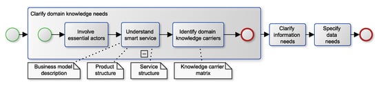 The goal of the process step Clarify domain knowledge needs is the documented identification of the knowledge required for the data specification as well as the associated knowledge carriers from the domain of the SSS. This involves all roles of the Core Team as well as the Digital Innovator. To perform this process step, the following inputs must be available: The business model description (e.g., in the form of the Smart Service Canvas [] or the framework for data-driven business models described in Exner et al. []), the product structure (derived from the product data management (PDM) system, see Section 3.4) and the service structure (e.g., created according to the MESSIAH [] or PSS-layer method []). The results of this process should be an understanding of the smart service from within the application domain as well as the roles and the names of the knowledge carriers required for the data specification. The whole Clarify domain knowledge needs process step can be performed in a single kick-off meeting. Depending on the complexity of the smart service as well as the number of domain knowledge carriers in question, a short meeting (about one hour) is sufficient. If necessary, up to two full-day workshops are required, but this represents an extreme case. The sub-processes explained below are shown in Figure 5.