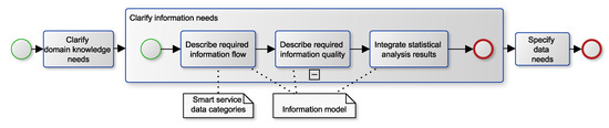 The goal of the Clarify information needs process step is to use the domain knowledge of the previously identified knowledge carriers to describe what information needs the smart service will have. All sub-process steps in this section involve the Core Team and the identified knowledge carriers. The result is the description of the required information flow as an information model (including a description of the information quality) for the development and operation of the smart service under consideration. The entire process step Clarify information needs can be done synchronously (in the form of workshops) or asynchronously (by modeling using a shared SysML information model)(see Section 3.3.4). The sub-processes explained in the following are shown in Figure 6.