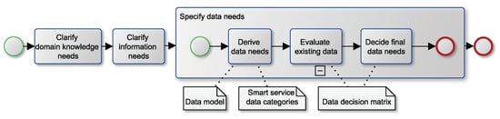 The goal of the Evaluate existing data sub-process step is to complete a technical fit-gap analysis comparing the data requirements described in the data model and the existing data. This involves assessing the extent to which the existing data meets the data needs. In addition to searching for relevant data, this also requires a technical assessment of the data quality. Here, the Data Analytics Specialist can be supported by the Information Service Provider (Provides supplementary data from external sources []), the Data Center Operator (Operates the IT infrastructure []), the Cloud Platform Provider (Operator of application-independent (external) cloud components []), and the Connectivity Provider (Responsible for technical interface (e.g., mobile network) between (smart) product and IT infrastructure []) are supported. The result of this process step is a qualitative assessment of the gap between data requirements from the domain expert’s perspective and the existing data. Nevertheless, the economic perspective is still not yet included in this final definition of the data requirements but is taken into account in the next step of the data specification process.