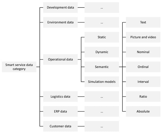 SemDaServ offers a hierarchical model of smart service data categories to create the most complete possible specification of the data required for a given smart service. The data category model presented in Figure 8 helps actors during the data specification to check if all data categories have been considered. The data category model is described hierarchically to tailor the abstraction level of the data specification appropriately to the smart service under consideration as well as to the particular requirements of the project (Particularly concerning the level of detail of the data specification (see Section 5)). We derived the data category model from the literature by combining data categorization systems from multiple domains. These domains included engineering, statistics, and computer science. The “data science” domain itself uses categorizations from statistics and computer science, so this domain was not considered separately.