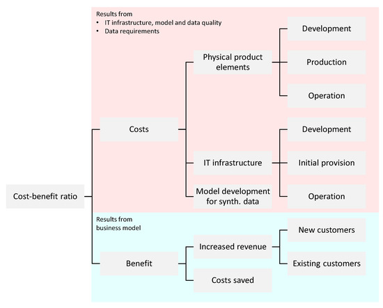 For the smart service development project to be successful, the resulting smart service must be profitable. For this reason, the data decision matrix includes information about the cost–benefit ratio of data collection. Methodologically, this is done through the cost-benefit analysis presented in Figure 9. The goal is to maximize the cost-benefit ratio. The economic benefit of the smart service is usually already determined and thus known before the start of the data specification process in the context of business model development and analysis through appropriate SSS requirements. The costs of developing and operating the smart service result from data requirements, IT infrastructure, the required quality of the AI models, and data quality. Data requirements result in costs for adapting or redeveloping physical product components for product development, manufacturing and operation. Furthermore, the IT infrastructure must be adapted due to additional data streams: Again, this includes development, initial deployment, and operating costs. The data requirements of the smart service can be partly covered by synthetic data from simulation models. This reduces costs in the area of physical product components but generates modeling costs if the existing simulation models have to be adapted, created, or expanded.