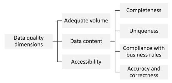 Once the technical and economic assessment of the data requirements is available, the data decision matrix shown in Table 3 can be filled in by the actors involved in the decision-making process based on the results of earlier steps in the data specification process. To do this, the variables specified in the data model are entered in the first column. This is followed by the decision of the Project Sponsor whether the variable located in the respective row should be measured in real terms or generated synthetically by simulation models. Data requirements and the existing data quality are entered in the following columns. This is done by first assessing the relevance of the information content () on a scale from 0 (information content of the variable is irrelevant) to 6 (the smart service cannot be developed according to the requirements without this variable). The Data Quality Score () is determined by assessing the existing data quality using the data quality dimensions based on [,] and shown in Figure 10. To do this, each major criterion is qualitatively estimated on a scale from 0 to 2. The meaning of the scale is defined as follows: