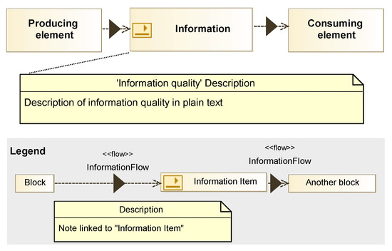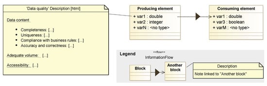Various artifacts are used and created as part of the data specification process. On the one hand, these artifacts serve to facilitate individual process steps by specifying the result formats in a structured manner. On the other hand, the artifacts also document the process results. The artifacts can be divided into two groups: (1) artifacts for describing data and information and (2) artifacts for supporting neural points during process execution. Group 1 artifacts use SysML for three following reasons. Frist, computer scientists and data scientists benefit from semantic data specification due to the formalized domain knowledge, and SysML’s proximity to Unified Modeling Language (UML), which is commonly used in SSSE [], is useful here. Next, SysML is a powerful modeling language that can represent arbitrary technical systems and software components. This makes it possible to describe the connection between the smart service and the physical holistically. Third, the increasing diffusion of model-based systems engineering (MBSE) makes it likely that the diffusion of SysML will further grow as well, and will be increasingly supported by IT tools. Thus, in an MBSE environment, semantic data specification for smart services can be carried out without media discontinuity in the context of system specifications, and can be seamlessly integrated into the model-based engineering of the future.