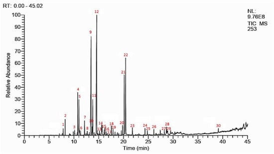 The identification of different chemical compounds contained in essential oils was carried out by gas chromatography coupled to a mass spectrometer. W. frutescens oil was analyzed using a Thermo Fischer capillary gas chromatograph directly coupled to the mass spectrometer system (model GC ULTRA S/N 20062969; Polaris QS/N 210729) using two columns, a non-polar HP-5MS capillary fused silica column (60 m 0.32 mm, 0.25 mm film thickness) and a DB-HeawyWAX column (30 m × 0.25 mm, film thickness 0.25 µm), in addition to GC-FID (flame ionization detector). GC-MS operating conditions were maintained as follows: initial temperature of 40 °C/2 min; speed of 2 C/min; a final temperature of 260 °C/10 min; injector temperature of 250 °C; and carrier gas of helium 1 mL/min. The essential oil was diluted in hexane with a dilution ratio of 10:100. The volume of the sample injected was 1 mL with the fractional injection technique; ionization energy was 70 eV, ionization mode; ion source temperature of 200 C, sweep mass range m/z 40–650, and interface line temperature of 300 C. Retention indices (RI) were determined with reference to a homologous series of n-alkanes and by matching their recorded mass spectra with those stored in the spectrometer database (NIST MS Library v. 2.0) [,,].