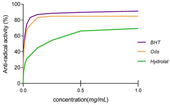 The antioxidant activity was assessed using the DPPH assay. The IC50 (the concentration of the sample required to inhibit 50% of free radicals) values of both EO and hydrolat were 14.031 ± 0.012 µg/mL and 232.081 ± 3.047 µg/mL, respectively. The IC50 value of BHT used as a positive control was 11.020 ± 0.903 µg/mL. ANOVA analysis showed no significant difference between the IC50 value of EO and that of BHT (p > 0.05). As shown in Figure 2, the essential oil showed interesting anti-radical activities when compared to BHT. In this sense, hydrolat showed limited antioxidant power when compared to the oil.