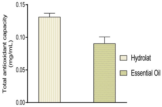 Essential oils are complex mixtures containing several compounds with different functional groups, different polarities, and different chemical behaviors. This chemical complexity could lead to different results depending on the test used. It is thus fitting that an approach with multiple assays aiming to evaluate the antioxidant potential of hydrolat and essential oils was conducted to validate the results obtained. The results obtained revealed that the total antioxidant capacity of EO and hydrolat were 0.091 ± 0.007 and 0.131 ± 0.004 mg AAE (ascorbic acid equivalent)/mg, respectively (Figure 3).