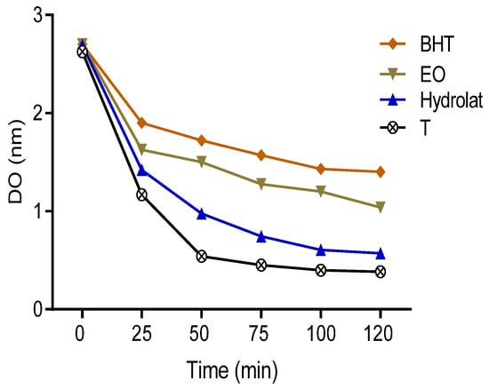 The degradation of fatty acids is one of the main causes of food spoilage as reported in many works. The inhibition of lipid oxidation is frequently ensured by the intervention of natural food preservatives. In the present research, lipid oxidation was assessed by measuring the inhibitory oxidation of linoleic acid in the presence of β-carotene, which was used as a marker. The results obtained showed that the absorbance of β-carotene gradually decreased in the presence of oils, hydrolat, and BHT. Moreover, the decrease in the negative control absorbance was the most important, followed by the hydrolat, essential oil, and BHT (Figure 4).